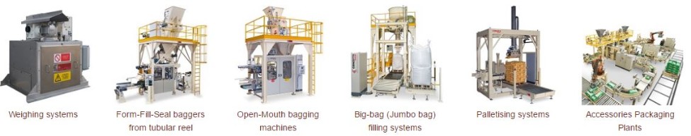 Suppliers of packaging machines for larger bags, semi automatic and automatis, Open Mouth Bagging, Form, Fill & Seal, Palletising Systems, Big Bag Filling machines for the Cereals & Seeds, Low Density Powders, Fertilisers, Plastic Granules, Flours, Milk Powder Cat Litter, Animal Feed, Building Materials, Pet Food, Sugar, Wooden Pellets