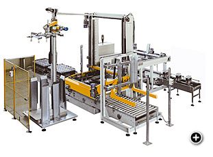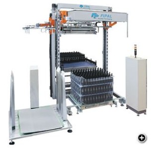 The product comes from the pacing conveyor where the row that will form the layer is programmed. Aflerwards, a push-off moves the rows onto a fixed plane and then onto a mobile plane supported by the lifting head. The latter moves up to the last layer of the pallet, translates the mobile plane containing the product layer and deposits it on the pallet, which comes from the pallet magazine due to a motordriven rolle