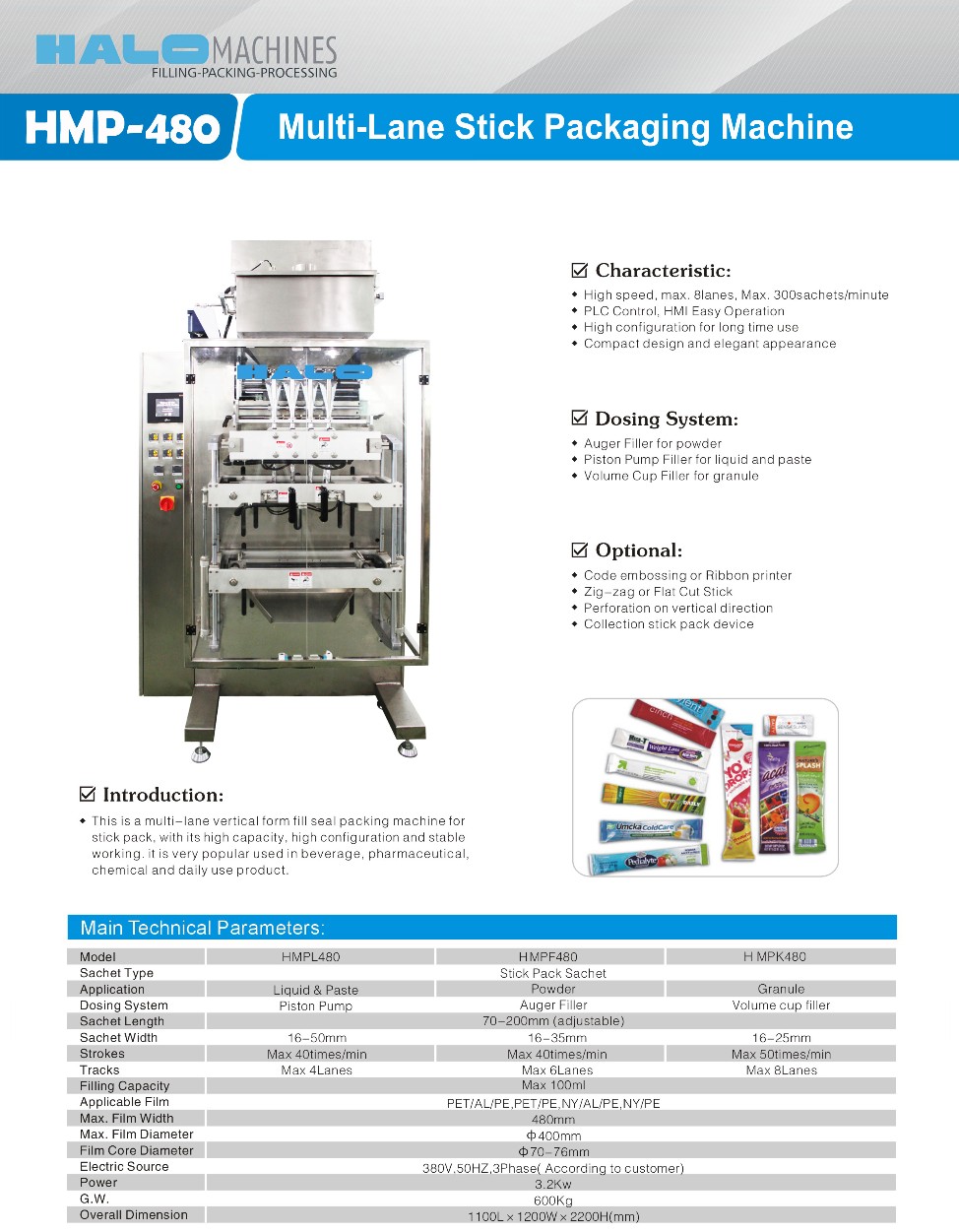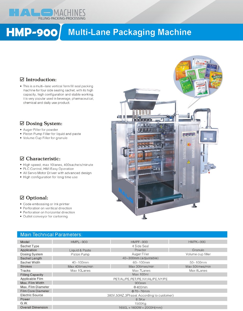 High Speed Multi Lane sachet packaging machine with option of 4 to 10 sachet lanes for packing powders, liquids and pastes in 4 side sealed sachets. Thepackaging machineis aHigh speed Multi lane vertical form, fill and seal (VFFS) packaging machinedesigned to package free flowing powders / granules, liquids, creams or pastes products. It is used widely for variety of applications ranging from packing liquid, semi liquid (shampoo, oil cream, ketchup) & powder products (Detergent powder, Tea, sugar, salt etc.)Adding to its versatility, the packaging machine Speed Multi-Lane sachet packaging machine seriescan be integrated with most fillers such as slider filler, piston filler and viscous paste filler. The machine produces 4 side sealed sachets and the number of lanes depends on the width of the sachet as the maximum roll width (web width) is 1000mm. The length of the sachet can be varied up to maximum 180mm using the PLC.