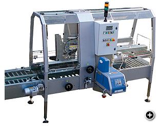 The side belts on the entrance phases pick up the box to transport it with the main conveyor to the gluing unit. As the box advances the front flap is closed, while the rear flap is closed by the pneumatic lever device; subsequently the side flaps are closed by the steel rods. The case sealing is executed by hot-melt glue spraying, which ensures a safe fixing of the case flaps in accordance with the EEC standards.