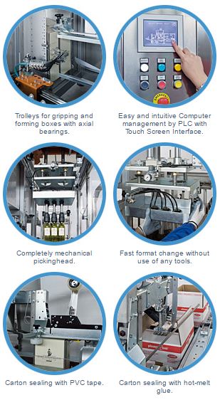 The above mentioned machine is completely automatic and suitable for packing glass and plastic bottles, jars, etc. in carton boxes, trays, PVC cases, with or without partitions.