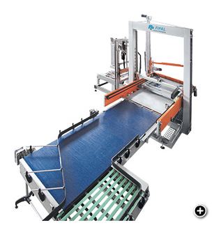 The product comes from the pacing conveyor where the row that will form the layer is programmed. Aflerwards, a push-off moves the rows onto a fixed plane and then onto a mobile plane supported by the lifting head. The latter moves up to the last layer of the pallet, translates the mobile plane containing the product layer and deposits it on the pallet, which comes from the pallet magazine due to a motordriven roller.