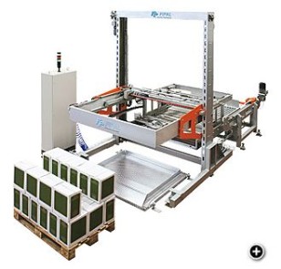 The product comes from the pacing conveyor where the row that will form the layer is programmed. Aflerwards, a push-off moves the rows onto a fixed plane and then onto a mobile plane supported by the lifting head. The latter moves up to the last layer of the pallet, translates the mobile plane containing the product layer and deposits it on the pallet, which comes from the pallet magazine due to a motordriven rolle